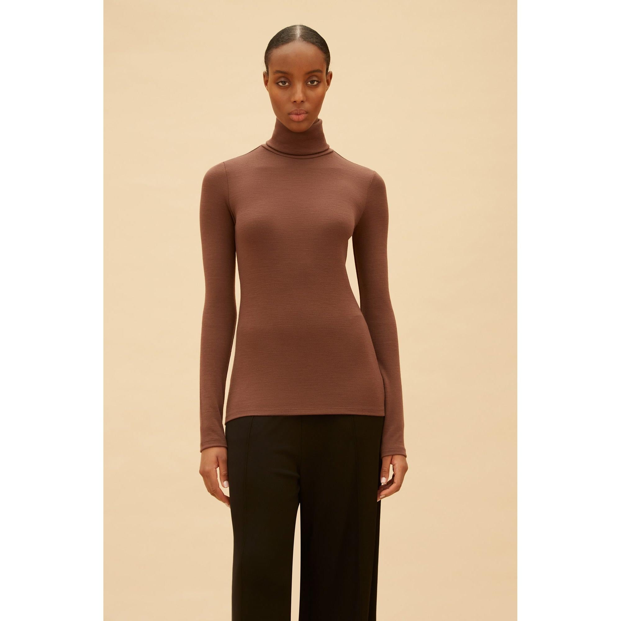 The ultimate turtleneck sweater that feels like a second skin and is perfect for layering. It has extra-long sleeves and a long waistband, but can be easily tucked into jeans or silk skirts thanks to its body-hugging fit. And it's so soft and warm! The model is deliberately cut very close-fitting for optimum comfort. If you are between two sizes or are unsure, we recommend choosing one size larger.